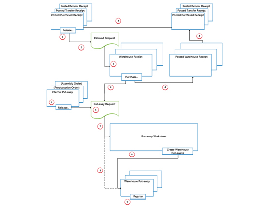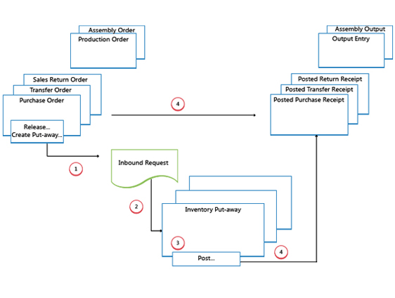 When items are received in the warehouse, the user who is responsible for receiving releases the source document, such as a purchase order or an inbound transfer order, to signal to warehouse workers that the received items can be put away in inventory. Alternatively, the user creates inventory put-away documents for individual order lines, in a push fashion, based on specified bins and quantities to handle.